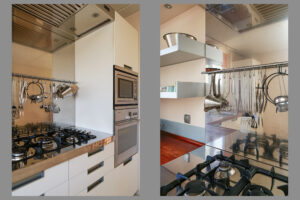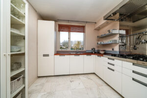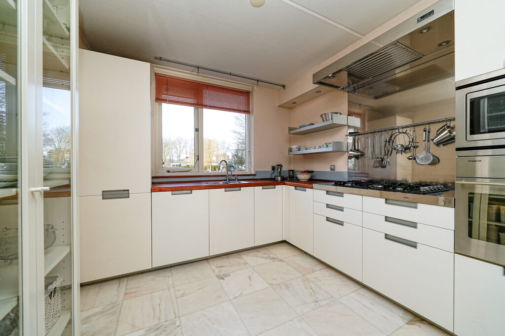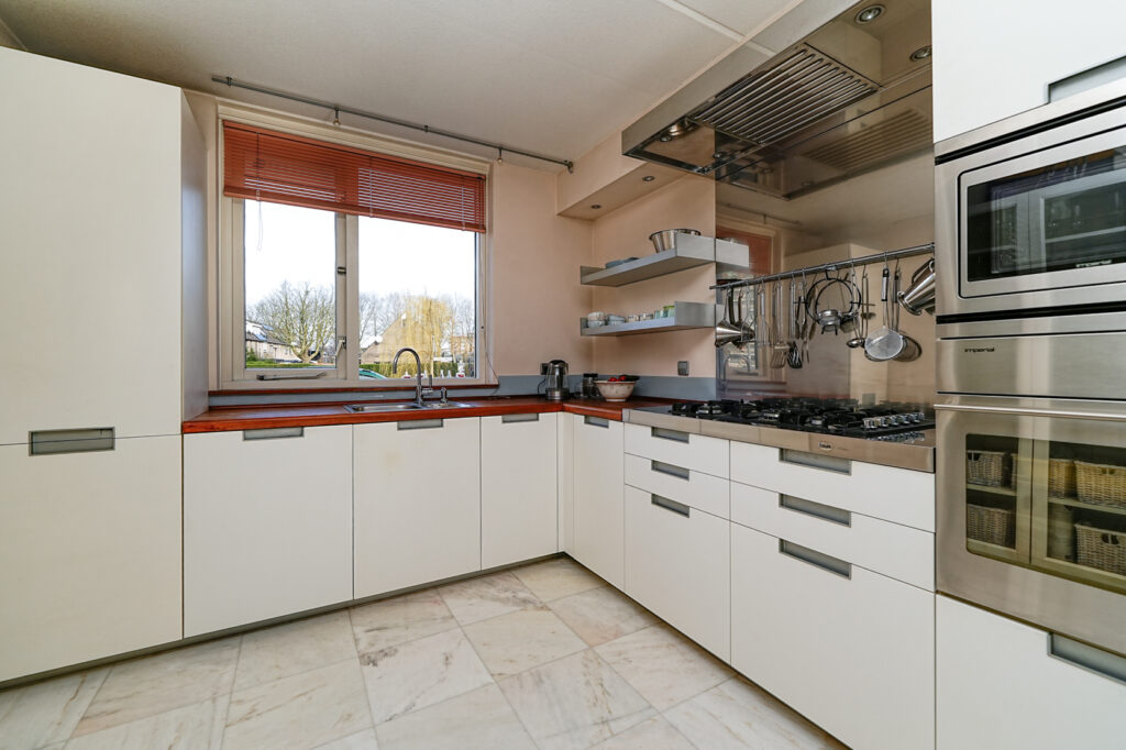 * De open keuken is gevestigd aan de voorzijde van de woning. De keuken is voorzien van een gaskookplaat, afzuigkap, vriezer, magnetron, oven, koelkast en een vaatwasser.