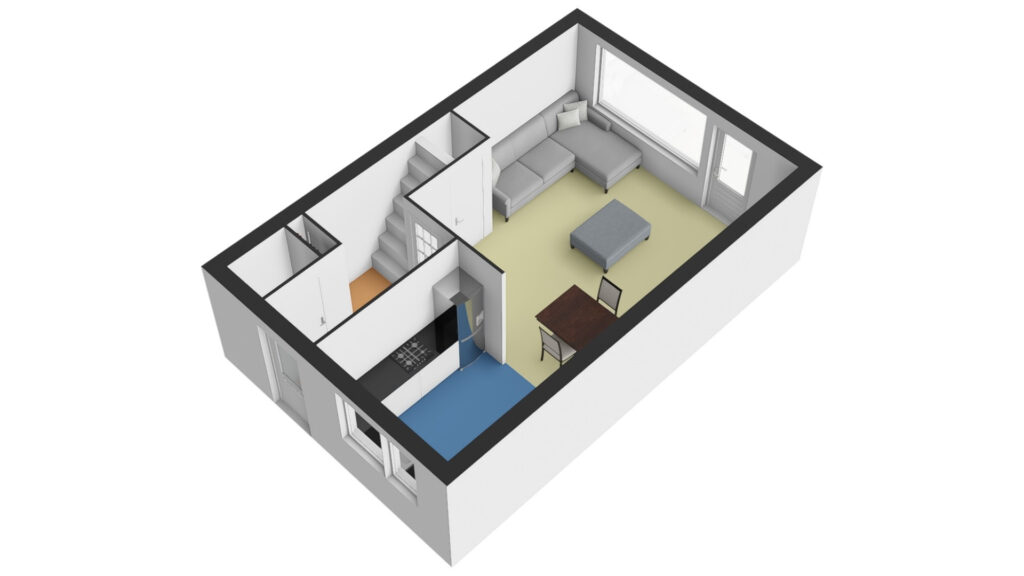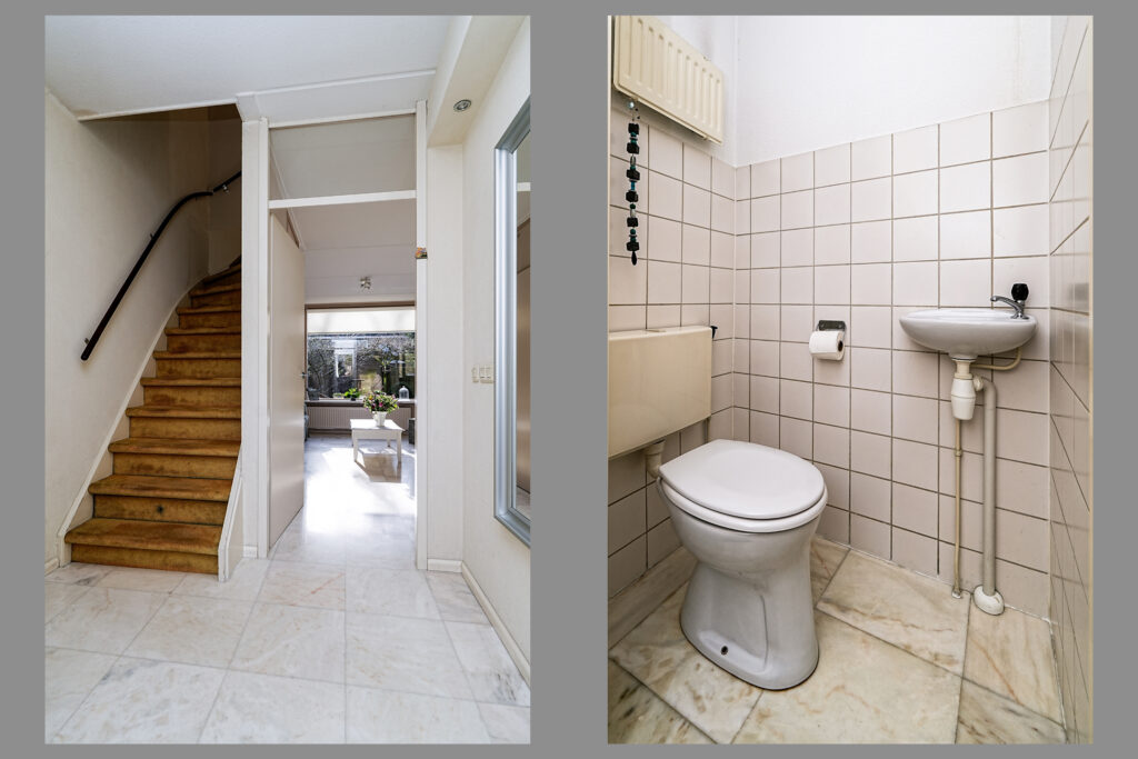 * Hal met het toilet, meterkast, trapopgang naar de eerste verdieping en toegang tot de woonkamer.