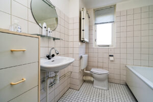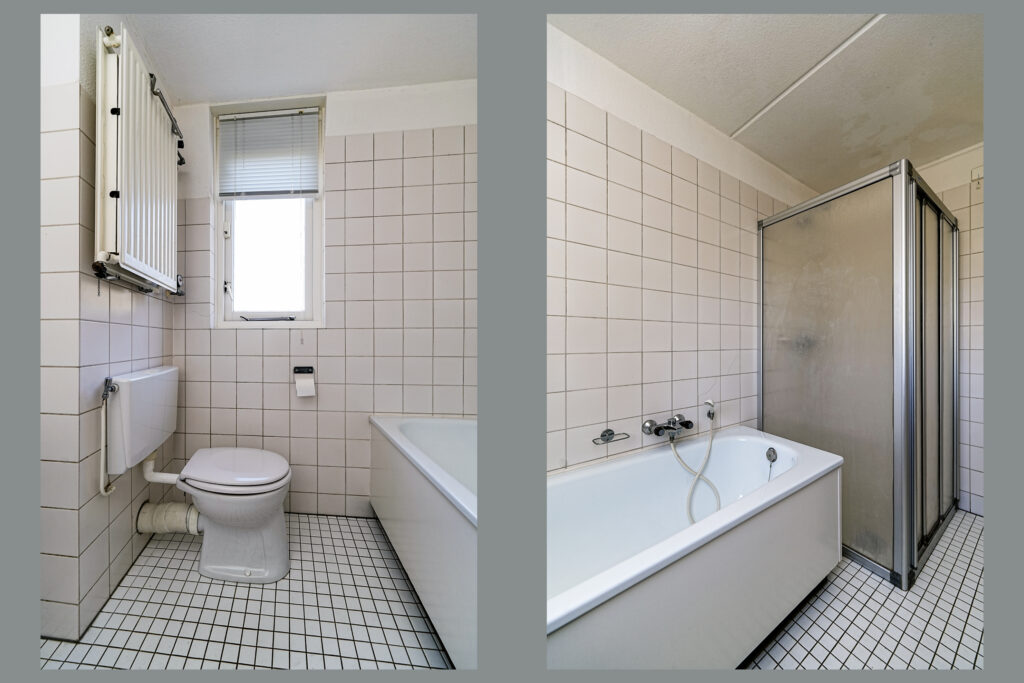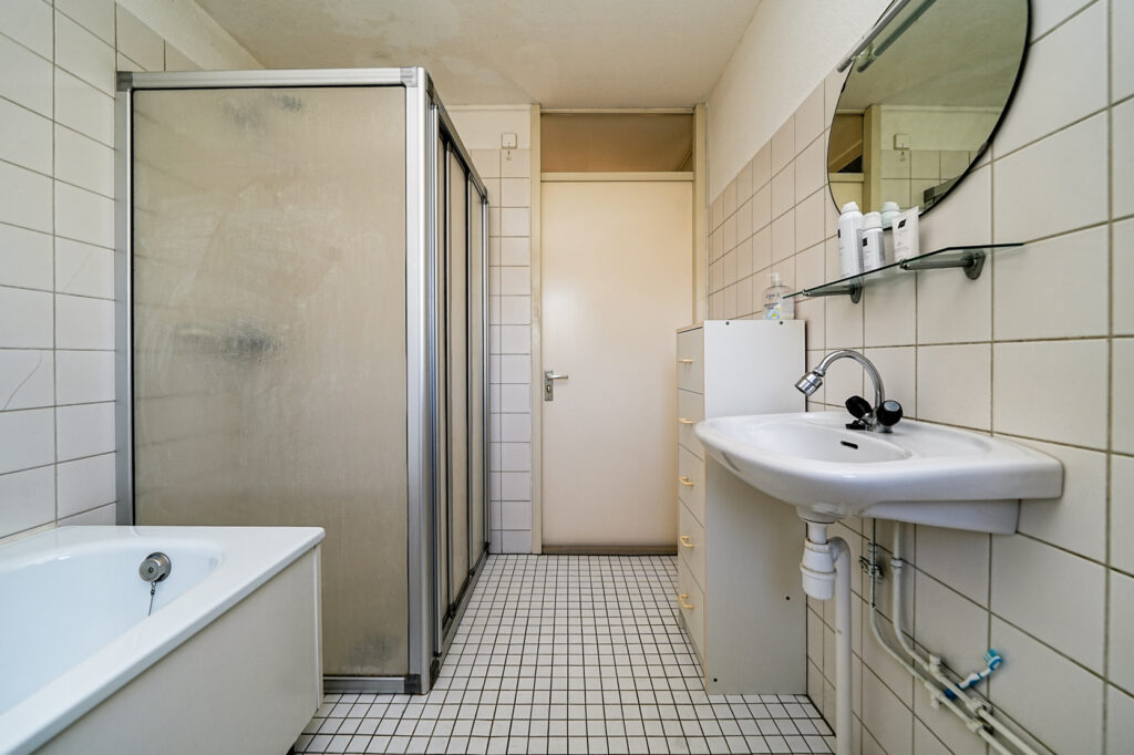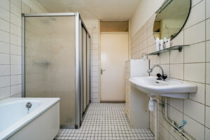 * De badkamer is voorzien van een ligbad, douche, wastafel en het toilet.