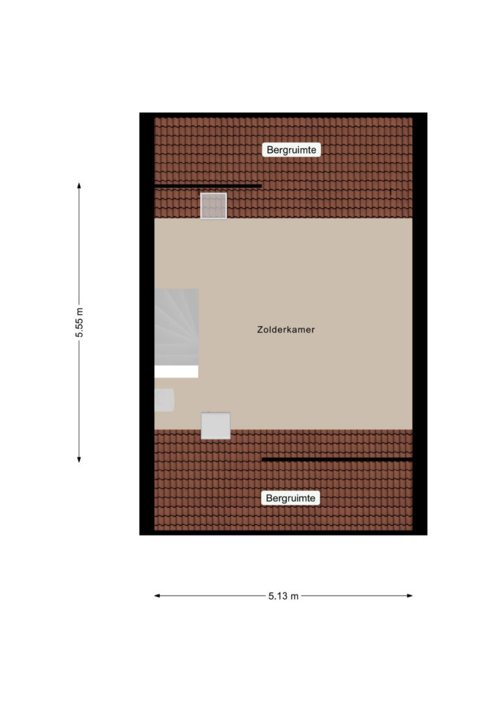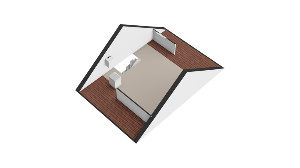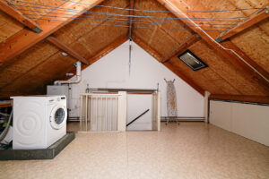* Open zolderkamer met de CV-opstelling en de wasmachineaansluiting. Zowel aan de voor- als achterzijde zijn er knieschotten waardoor er veel bergruimte is gecreëerd.