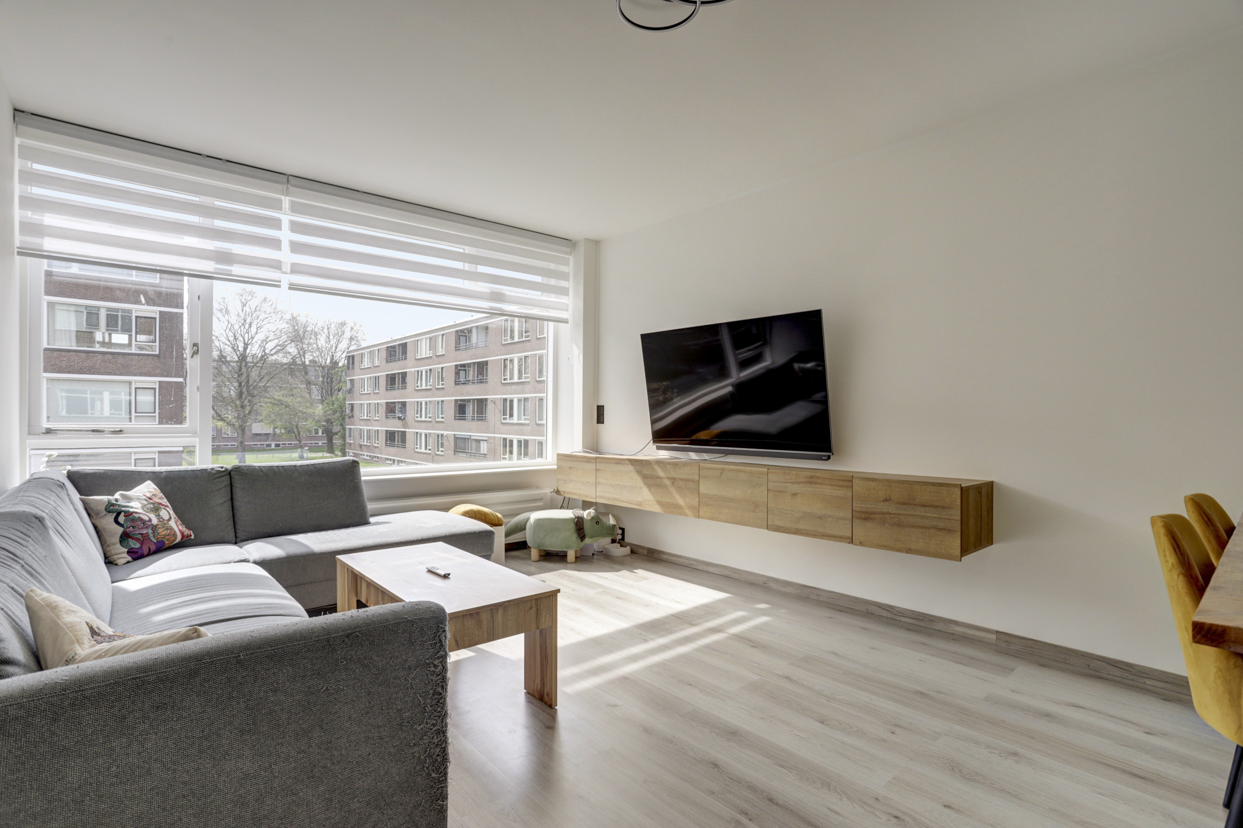 * De woonkamer bevindt zich aan de voorzijde van de woning;