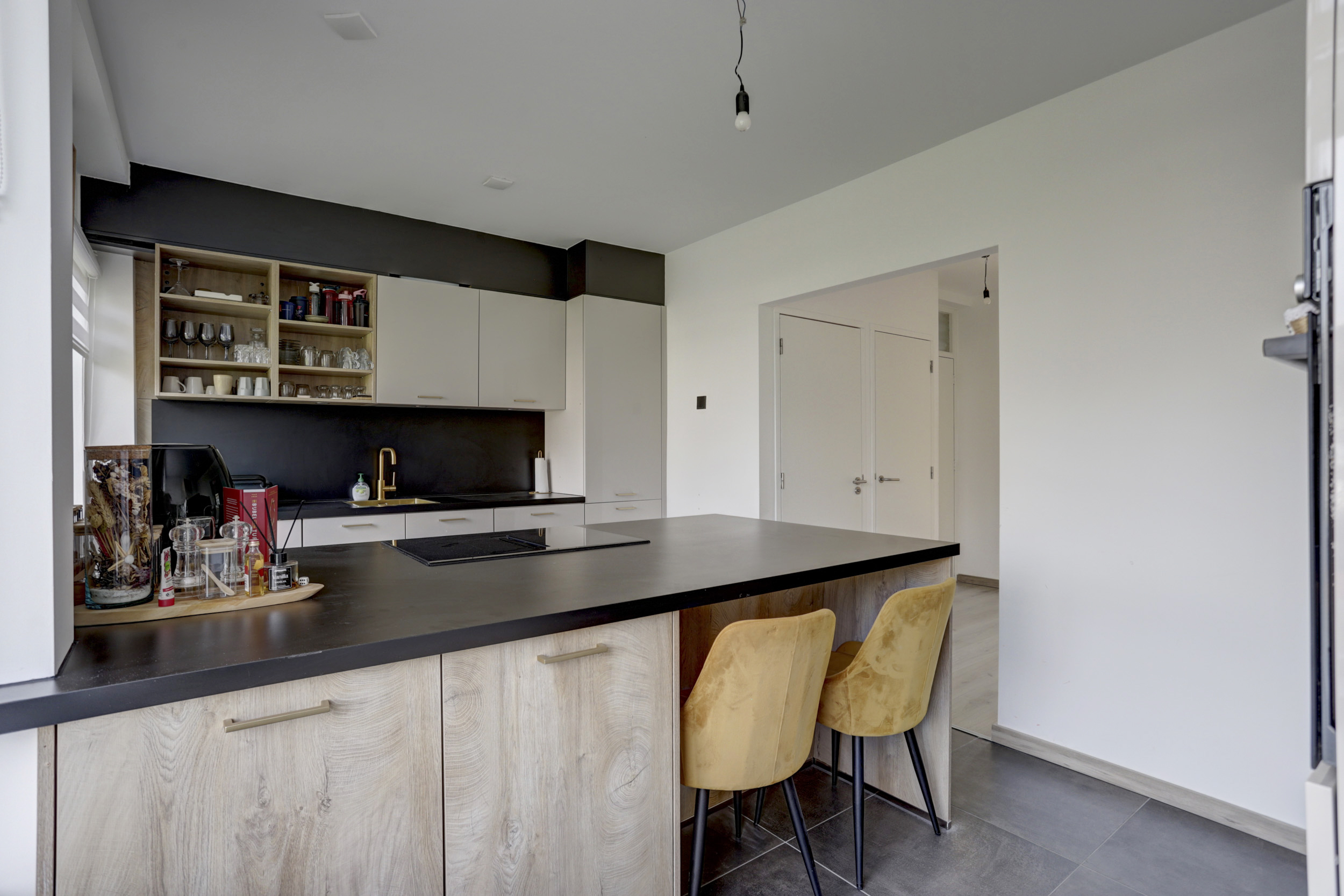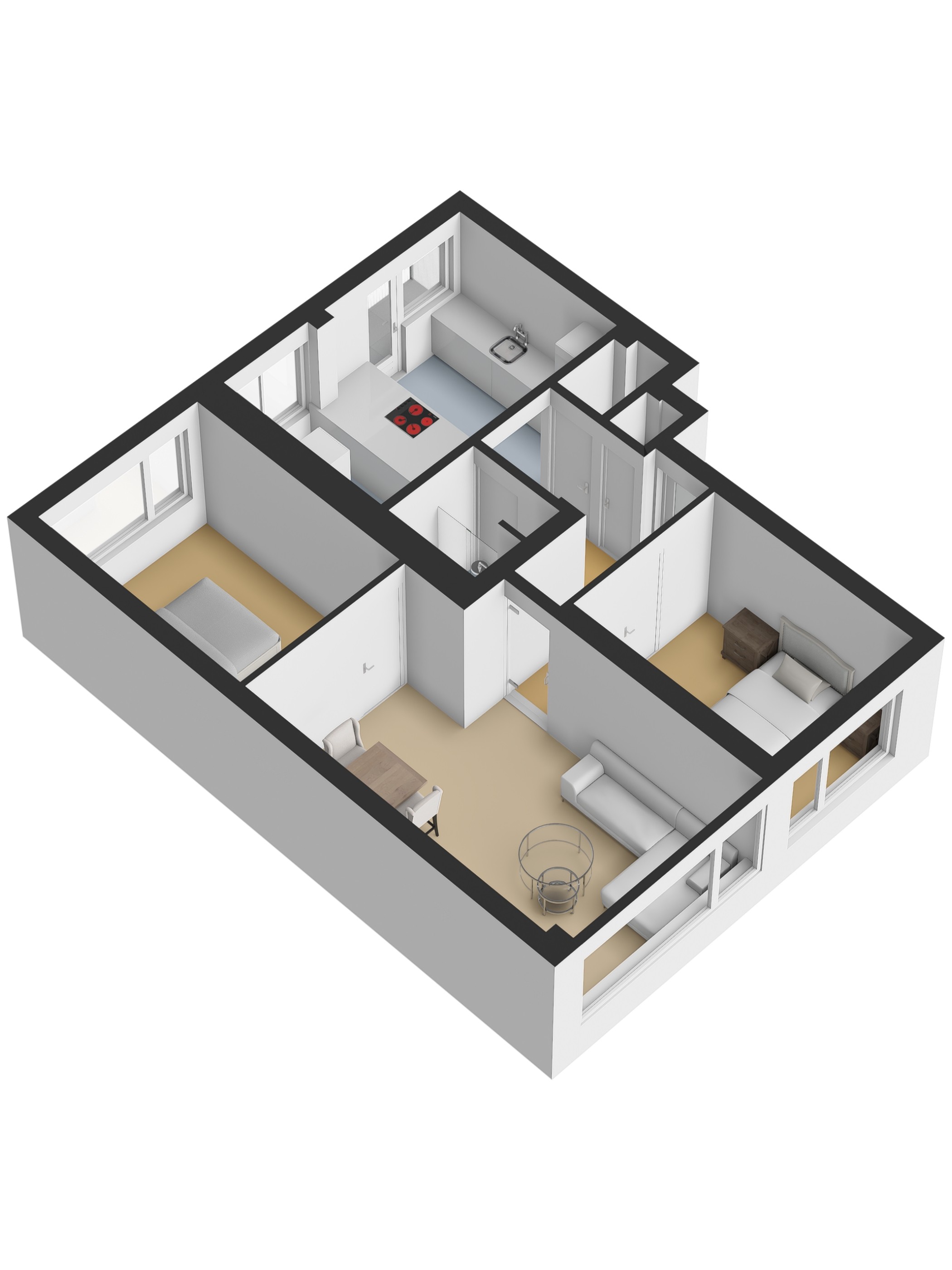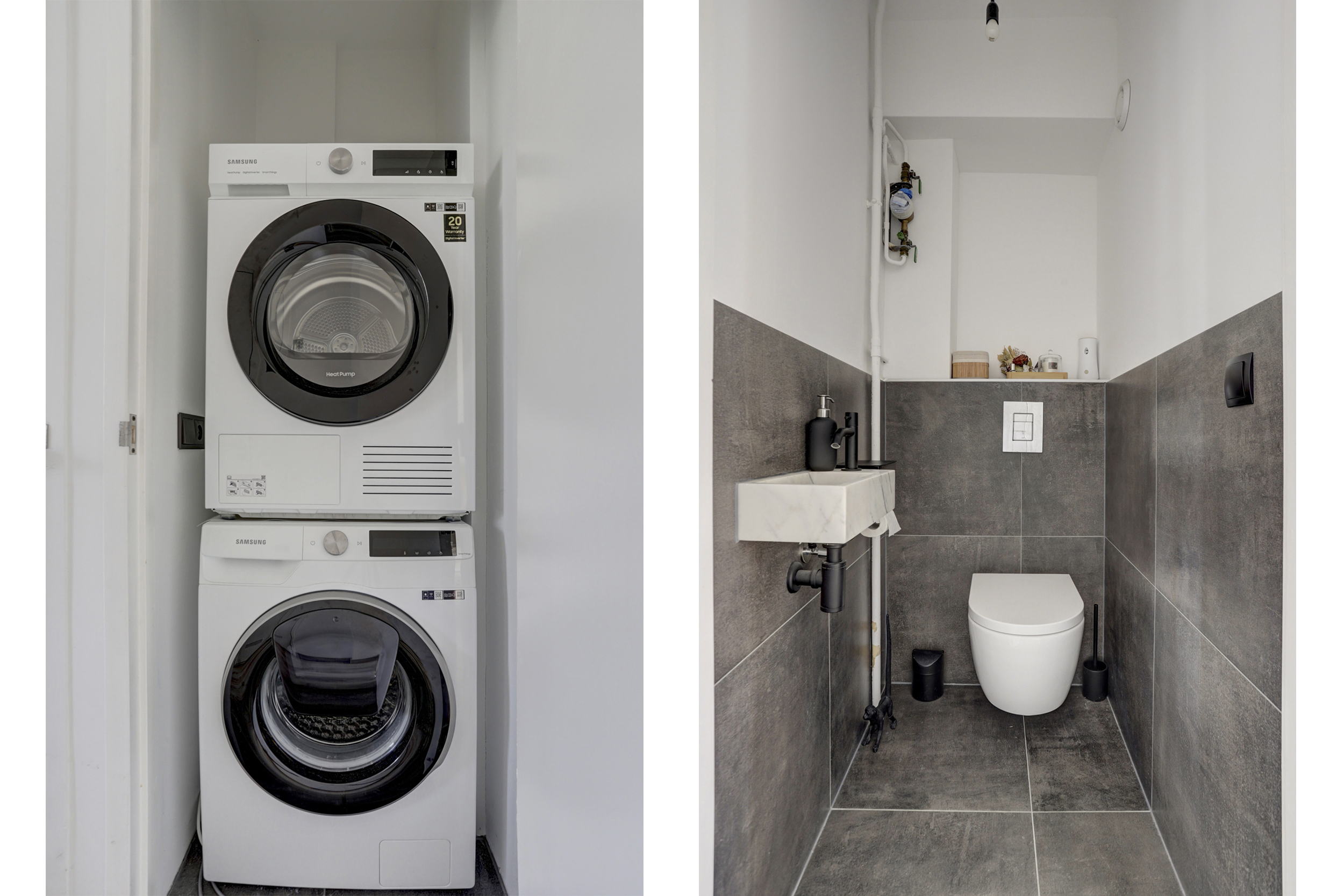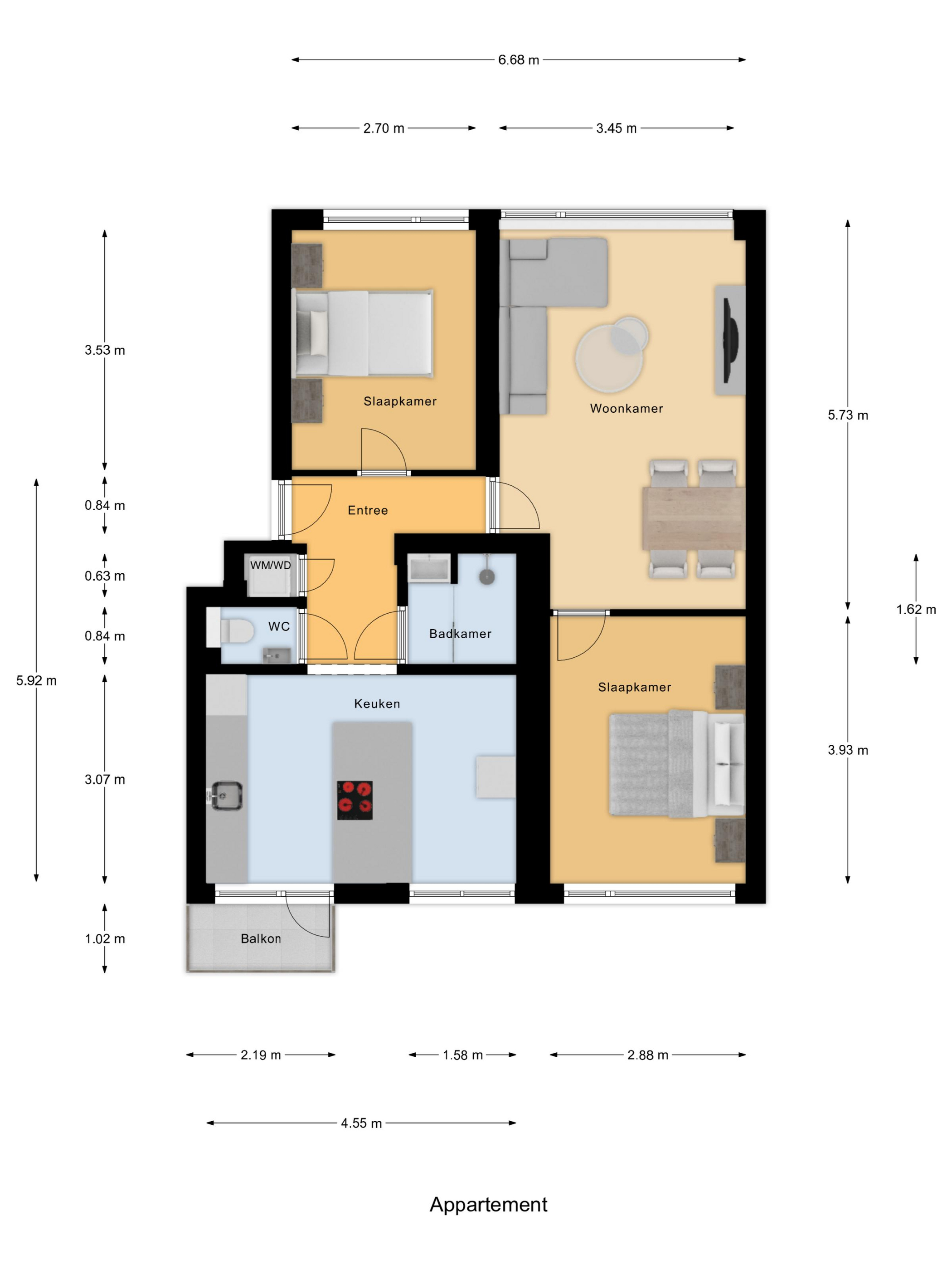 * Hal met toilet geeft toegang tot de woonkamer, keuken, badkamer en slaapkamer;