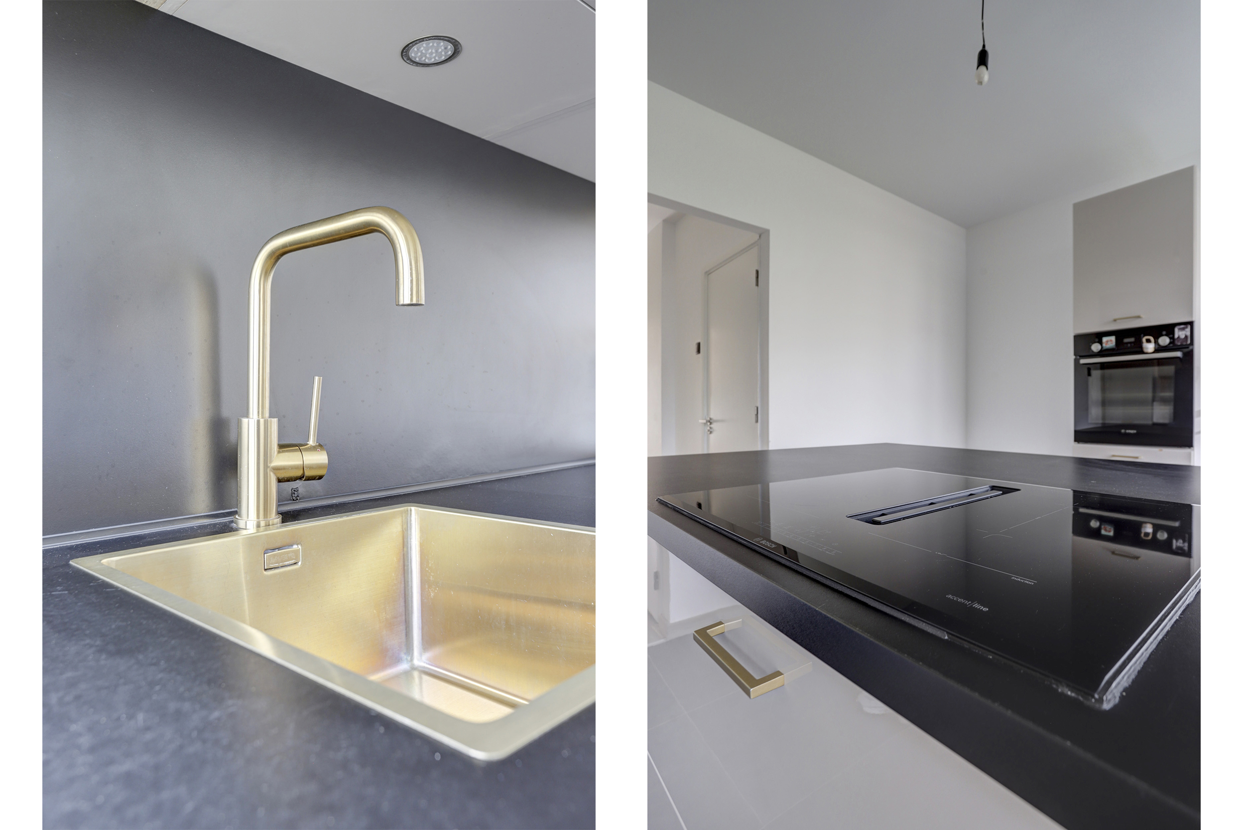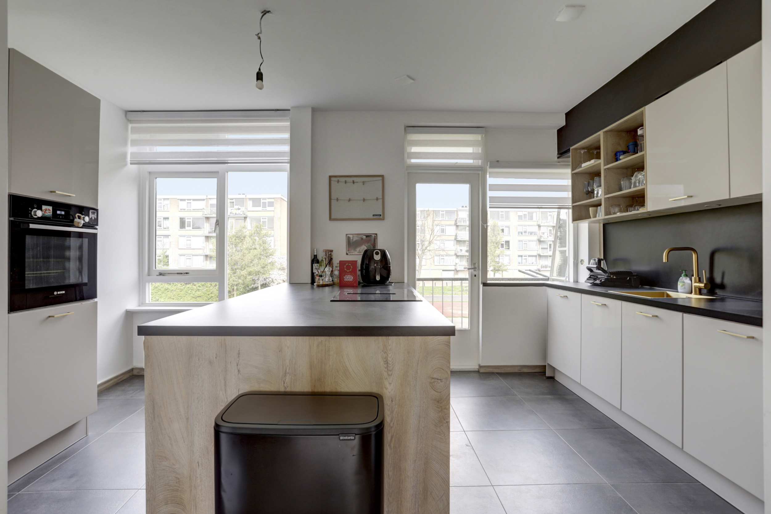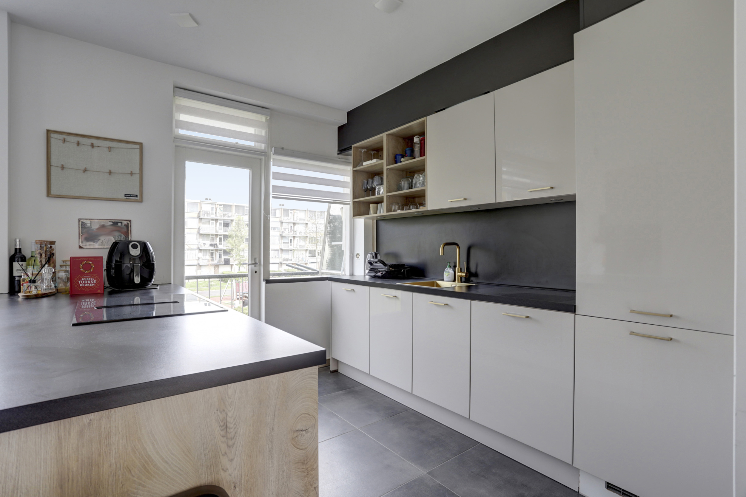* De keuken bevindt zich aan de achterzijde en is voorzien van een koelkast, vriezer, keramische kookplaat met afzuiging, vaatwasser en oven. Middels een deur is er toegang tot het balkon;