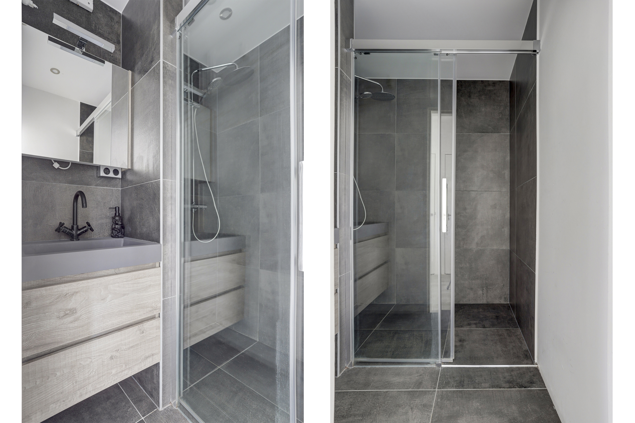* De badkamer is voorzien van een douchecabine en een wastafelmeubel.