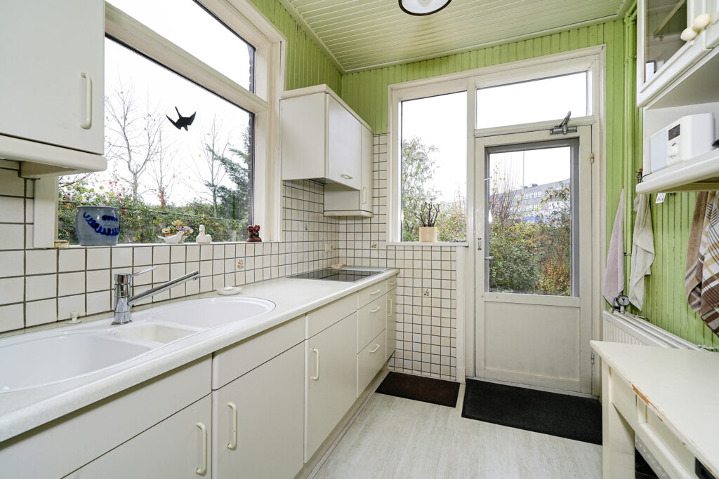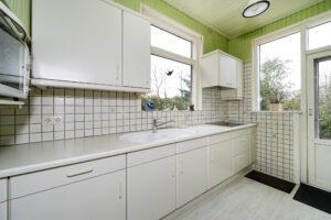 * De keuken bevindt zich aan de achterzijde van de woning en geeft toegang tot de achtertuin. De keuken is voorzien van een dubbele spoelbak, keramische kookplaat en een koelkast;