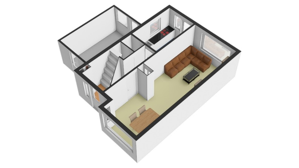 * De woonkamer loopt over de volledige lengte van de woning en heeft veel natuurlijk lichtinval;