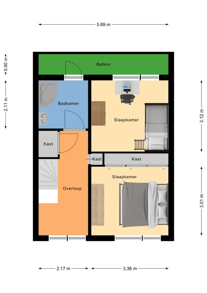 * De overloop met trapopgang en opbergkast geeft toegang tot de slaapkamers en de badkamer;